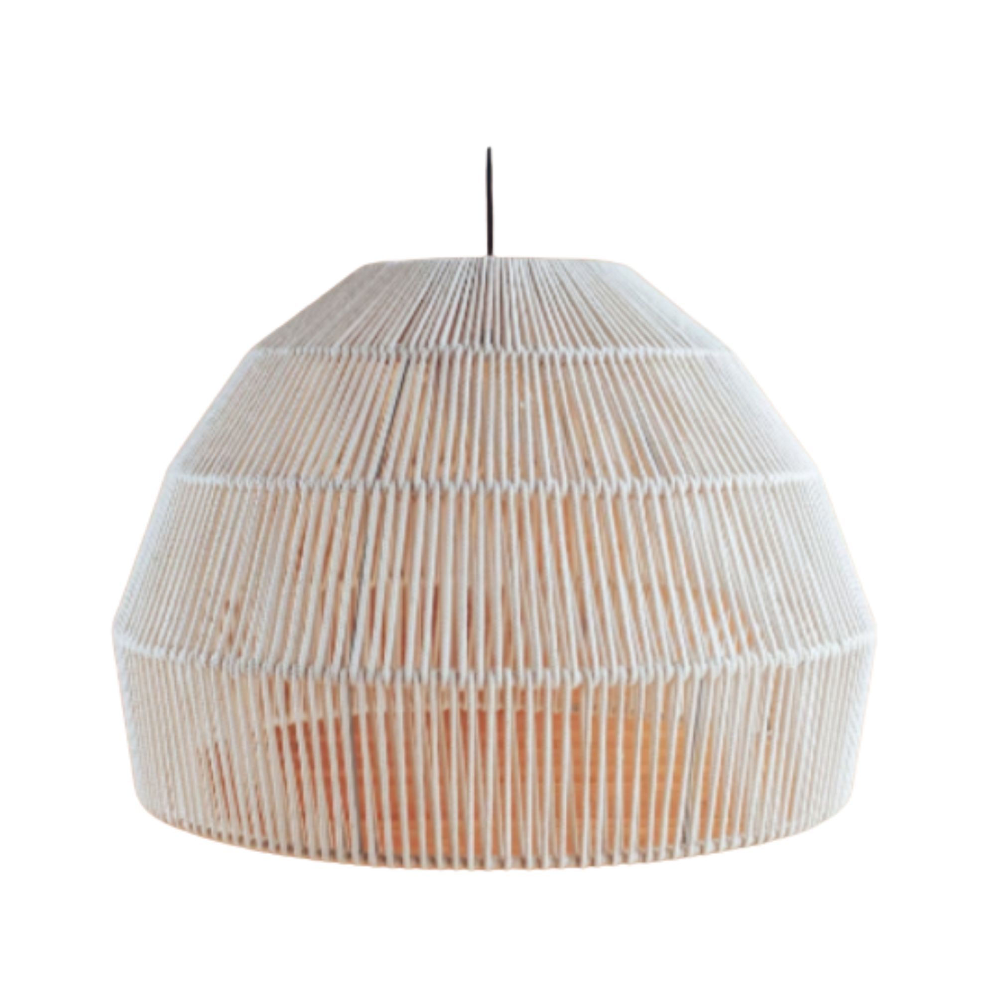 Esse tipo de trama, deixa a luz vazar com leveza dando um efeito lindíssimo ao ambiente. Cada peça é única. O bocal é de metal na cor cobre vintage revestido com corda náutica.